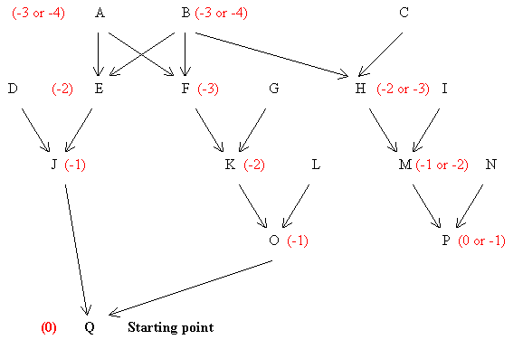 The starting point is the central or nominated person in the research, who is given the number 0. Thus, all ancestral generations will have negative numbers and descendant generations positive ones. After determining the generation numbers of all ancestors and descendants (and their siblings) it will be possible to calculate forward to more distant collateral relatives from appropriate common ancestors. The diagram below illustrates this method:-